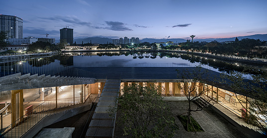 多轮推敲后,“标准营造”最终决定只保留部分旧建筑,其中着重保留钟楼。其历史不过十几年,但作为南湖至高点,钟楼已然成为蒙自市民集体记忆中的城市地标。在设计方案中,一个回环起伏的混凝土结构向湖面延展开来,连接起旧建筑与亲水平台,却与两者脱开。漂浮的屋顶平台背靠钟楼,面向湖水,为蒙自市民创造出真正开放的城市公共空间。