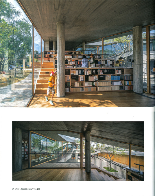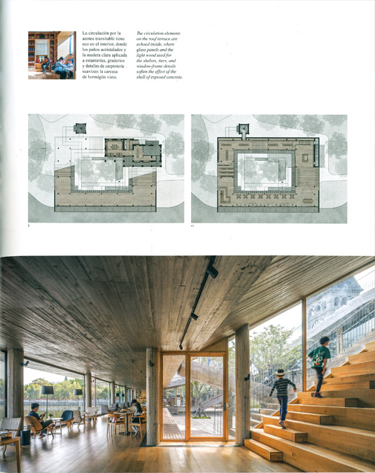 La circulación por la azotea transitable tiene eco en el interior, donde los paños acristalados y la madera clara aplicada a estanterías, graderíos y detalles de carpintería suavizan la carcasa de hormigón visto.