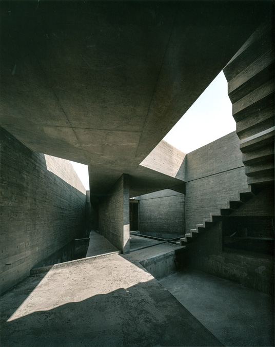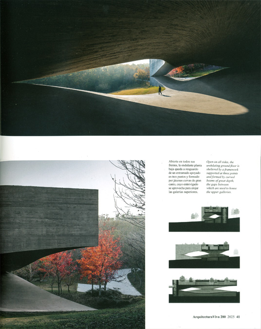 El recorrido anular de los visitantes se estrecha y ensancha en tanto que suaves rampas traban los diferentes niveles, lo cual genera una rica secuencia espacial que potencian los desnudos paramentos de hormigón te?ido de negro.