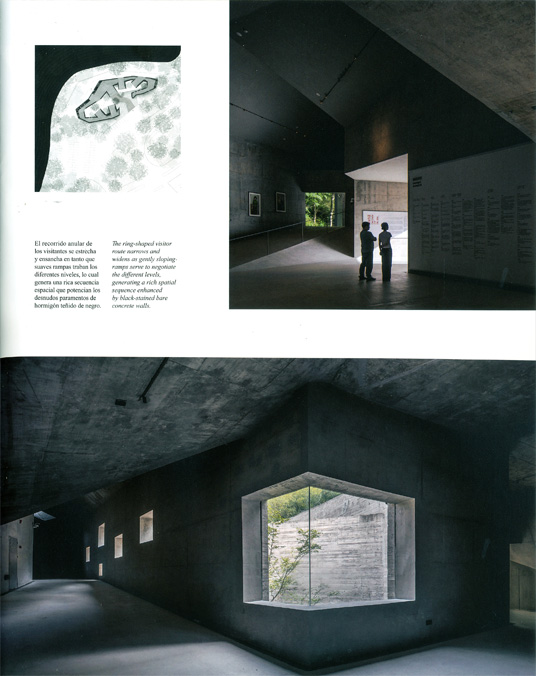 The ring-shaped visitor route narrows and widens as gently sloping ramps serve to negotiate the different levels, generating a rich spatial sequence enhanced by black-stained bare concrete walls.