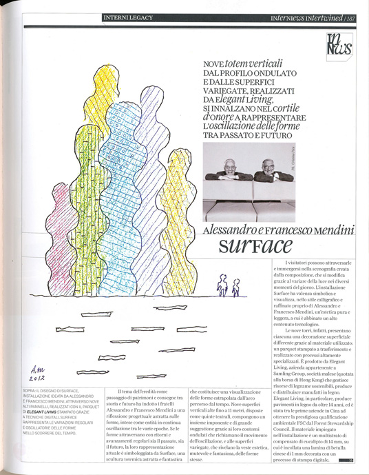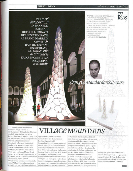Pianificazione urbanistica e landscape design sono tra le specializzazioni di Standardarchitecture, studio di progettazione con sede a Pechino fondato nel 2001 da Zhang Ke, a cui sono associati Zhang Hong e Claudia Taborda. Ed è alla dimensione progettuale urbana che ha attinto lo studio cinese per sviluppare il tema dell'eredità in architettura: la vita in montagna, considerala dalla cultura cinese un modello equilibrato, dovrà tornare ad essere praticata una volta che lo sviluppo della popolazione mondiale e l'erosione dei terreni agricoli obbligheranno a cercare nuovi modelli. Come i Village Mountains, montagne artificiali alte fino a 600 m, costituite da agglomerati di cellule abitabili e autosufficienti per ciascun nucleo familiare. I progettisti di standardarchitecture hanno portato ad Interni Legacy la rappresentazione di questo modello urbano futuribile: tre torri di forma organica, che si allungano in picchi lineari e fluidi, alte 4,5 e 6 metri e posizionate nel cortile d'Onore, rappresentano un richiamo allo stile di vita legato alla montagna, e nello stesso tempo configurano un modello urbano e paesaggistico prossimo venturo. Le torri Village Mountains sono realizzate con 446 pannelli d'acciaio ultrasottili, di 3 mm di spessore, saldati pei ottenere una struttura a nido d'ape autoportante e dipinta di bianco. L'impatto estetico della composizione durante il giorno è quello di una forma astratta e straniante, che con il calare del buio si trasforma in un Corpo vivido e animato grazie ad un sistema di retroilluminazione di iGuzzini proiettato su pannelli di plexiglas con cui è rivestita la facciata interna delle torri. Ha contribuito alla realizzazione dell'installazione il brand cinese Camerich, diffuso capillarmente in Cina e in quasi sessanta Paesi del mondo. La sua produzione copre a tutto campo il settore dell'arredo domestico con progetti e ricerche nell'ambito di un lifestyle contemporaneo e raffinato.