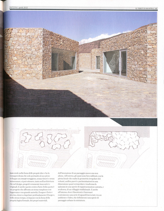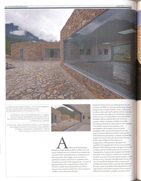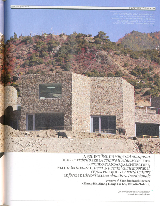 A 2900 metri di altitudine, all'ingresso della cittadina di Pai, in Tibet, può non essere semplice trovare le misure di un progetto per un centro d'arte contemporanea. Le tradizioni sono forti e presenti e il paesaggio, con i suoi colori, i materiali, le texture, i panorami, è un partner molto stimolante ma anche molto ingombrante. A questo si aggiunge il fatto che i progettisti provengono da Pechino e quindi sono esponenti di una cultura egemone che, ormai da molti anni, si trova spesso in conflitto con la minoranza tibetana. Standardarchitecture è uno studio giovane che si è costituito nel 1999 ed è formato da Zhang Ke, Zhang Hong, Ru Lei e Claudia Tabora, e dove confluiscono la cultura cinese, gli studi condotti anche in America e la provenienza portoghese di Claudia che, dopo la laurea a Evora, si è specializzata, come il fondatore Zhang Ke, all'università di Harvard. E nel loro progetto, infatti, sembrano confluire con molta naturalezza elementi di culture diverse. Per esempio, è inevitabile supporre che quell'idea, così paesaggistica, dei semplici volumi in pietra appoggiati sullo zoccolo del basamento non sia proprio estranea alla stereometria così frequente nell'architettura portoghese, e proprio a iniziare dal progetto di Alvaro Siza a Evora, la città di Teresa. D'altro canto, la libertà d'invenzione e il pragmatismo, nell'organizzare gli spazi e nel modellare la topografia del terreno, sono i caratteri distintivi dell'architettura cinese di oggi. Si pensi, per esempio, al lavoro di Wang Shu che, non ancora cinquantenne, è appena stato insignito del Pritzker Prize 2011. Il suo Amateur Architecture Studio ha prodotto una serie di lavori di grande qualità, e molto diversi tra loro, che ogni volta affrontano il tema e il silo con una libertà d'azione totale, senza porsi il problema di restare fedeli a una data cifra stilistica e formale. Anche il portfolio di Standardarchitecture spicca per la varietà delle soluzioni. Osservando le differenze tra progetto e progetto, si capisce che il team crede nella forza delle proprie idee ha la consapevolezza che solo portando al suo pieno sviluppo un concept coraggioso, senza timori e senza autocensure, si può ottenere, tanto nell'architettura che nel design, progetti veramente innovativi e originali. E anche questo centro d'arte d'alta quota è un progetto che affronta un tema complesso con leggerezza e con grande autorità. Il segno è forte e preciso, riesce a rispettare profondamente il luogo e, nello stesso tempo, si impone con la forza della propria logica formale, dei propri materiali, dell'invenzione di un paesaggio nuovo ma non alieno. All'esterno, gli spazi sono ben calibrati, con la pietra locale che esalta la geometria irregolare dei volumi, unifica pareti e pavimentazioni in una dimensione quasi vernacolare e trasforma la spianata in una specie di rappresentazione astratta, e scultorea, di un villaggio tradizionale. E anche all'interno, dove i finestroni e i lucernari costruiscono una serie di sguardi incrociati, tra un ambiente e l'altro, che definiscono una specie di paesaggio urbano in miniatura.