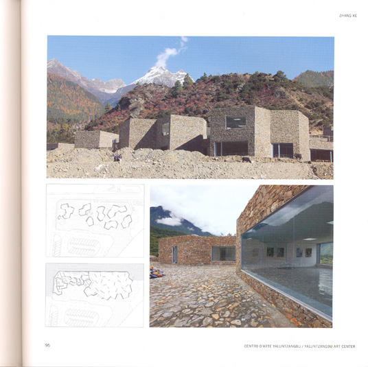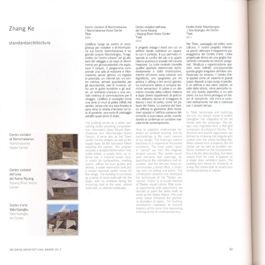 Nel Tibet, paesaggio ed edifici sono tutt'uno. Il nostro progetto intendeva perciò rafforzare l'integrazione paesaggistica del Centro d'arte. L'idea progettuale deriva da una griglia liberamente composta da blocchi poligo-nali. Struttura e organizzazione spaziale sono definite sovrapponendo questa griglia irregolare all'intero sito. Osservato da lontano, il Centro d'arte appare come un insieme di grandi massi disposti a caso lungo il pendio. È un edificio a due piani, eppure, se visto dalla strada, viene percepito come uno Spazio espositivo a un solo piano. La sua forma persegue un ideale di semplicità, che mira a conciliare radicamento nel sito e coerenza con il proprio tempo.