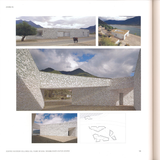Il progetto indaga i modi con cui un edificio isolato stabilisce un rapporto con il contesto. Il suo perimetro risponde ai confini del sito e lo spazio interno pubblico è scavato nel volume irregolare. La corte centrale connette quattro aperture determinate dall'orientamento e dalla distribuzione, mentre all'interno sono collocati una biglietteria, uno spogliatoio per chi pratica il rafting e dei servizi igienici. La costruzione adotta e sviluppa tecniche vernacolari. Il colore è un elemento cruciale della cultura tibetana e dopo diversi esperimenti di policro-mia abbiamo deciso di tinteggiare di bianco i muri di pietra, come nel palazzo del Potala. La purezza del bianco rafforza la geometria delle transizioni spaziali e l'edificio conserva felicemente la sua natura umile, manifestando al contempo un carattere marcatamente contemporaneo.