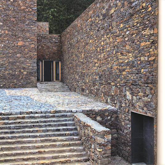 The intention of the designers to enact and modernize the stone traditions of Tibetan architecture is clear and, in fact, quite successful. This can be seen in the cuts, thicknesses, hardness and severity of the wall coverings, the roofs and the pavements. This was done thanks to the expertise of local craftsmen who built with the stone and who used traditional methods to make the windows and doors.