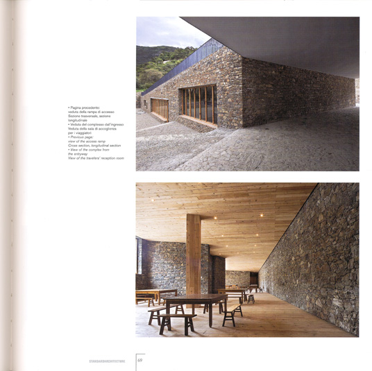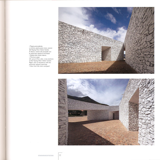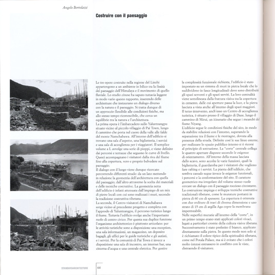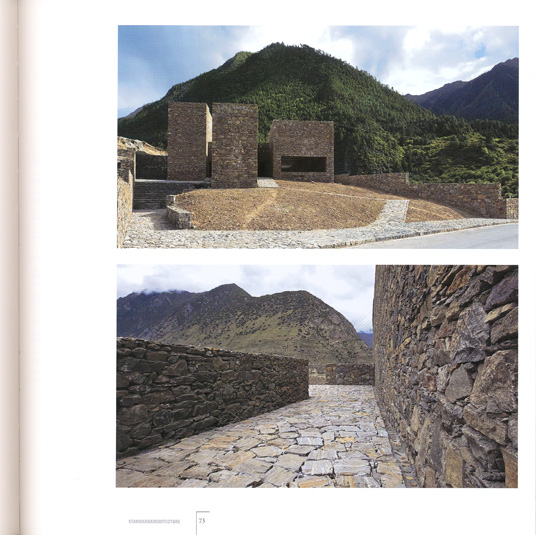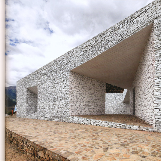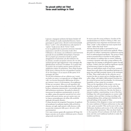 E che la qualità locale sia generata attraverso materiali, maestranze e metodi di costruzione locali. Dove l'obbiettivo è di ottenere una architettura contemporanea partendo da una sensibilità antropologica. Il gruppo dei tre progetti qui presentati si fonda su questo atteggiamento di attenzione più alla tradizione che al contesto, secondo una ipotesi comune che vari altri architetti giovani oggi suggeriscono come passaggio alla globalizzazione attraverso il localismo. È su queste basi di pensiero che mi sembra nascere questo piccolo ma significativo trittico di architetture. Sono rifugi di pietra locale sparsi a distanza fra loro nel grandioso scenario di un vasto fiume e di un canyon ad alta quota, fra le montagne del Tibet.