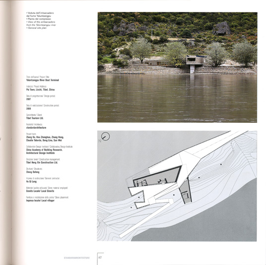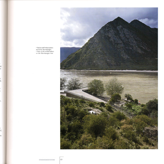 The first work is the embarcadero on the Yaluntzangpu river near the small village of Pai Town, at the last stop along the path that leads into the heart of the valley on the slopes of mount Namchabawa. It contains a waiting room, a ticket office, bathrooms and a reception room for travelers.