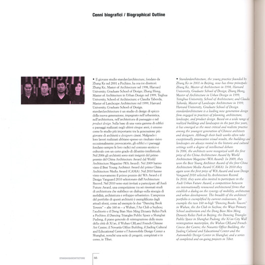In recent years the young architects, founders of the standardarchitecture Studio in Peking in 2001, have participated in many important international events. Their "credo" is that architecture must express local "spirit" rather than local "form".