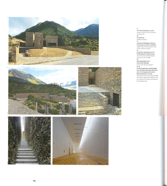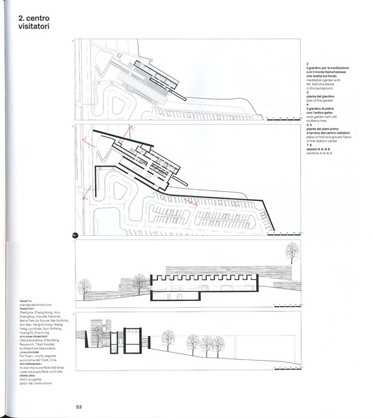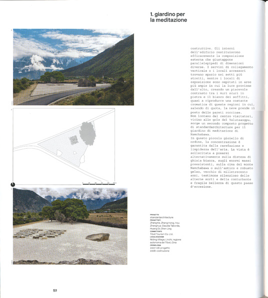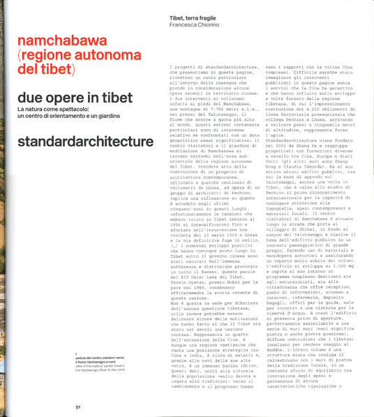 I due interventi si collocano infatti ai piedi del Namchabawa, una montagna di 7.782 metri s.l.m., nei pressi del Yalutsangpu, il fiume che scorre a quota più alta al mondo. Questi estremi certamente particolari sono di interesse relativo se confrontati con un dato geopolitico assai significativo: il centro visitatori e il giardino di meditazione di Namchabawa si trovano entrambi nell'area sud-orientale delta regione autonoma del Tibet. Prendere atto della costruzione di un progetto di architettura contemporanea, collocato a qualche centinaio di chilometri da Lhasa, ad opera di un gruppo di architetti di Pechino, implica una riflessione su quanto è accaduto negli ultimi cinquant'anni in questi luoghi.