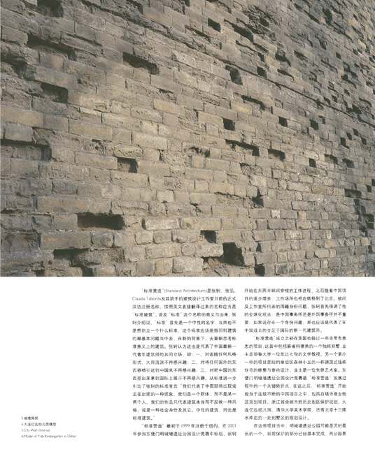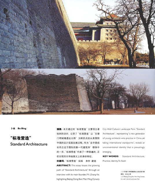 ABSTRACT: This essay traces the growing path of "Standard Architecture" through an interview with its main founder, Mr. Zhang Ke, highlighting Beijing Dong Bian Men Ming Dynasty City Wall Cultural Landscape Park."Standard Architecture", representing "a new generation of young architects who practice in China yet taking international standpoints", reveals an unconventional identity that is prevailingly emerging.