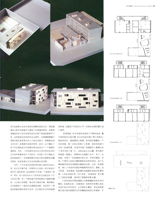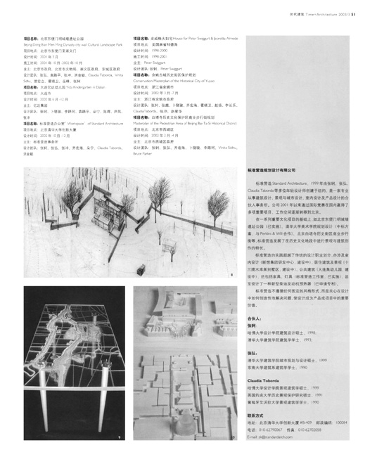 “标准营造”成立之初在美国也做过一些非常有意思的项目,这其中包括麻省科德角的一个独栋别墅,业主是耶鲁大学一位年过七旬的文学教授。另一个更小一些的项目是纽约皇后区森林小丘的一栋德国式独栋住宅的修整与室内设计,业主是一位先锋艺术家。东便门明城墙遗址公园设计竞赛是“标准营造”发展过程中的一个关键转折点,在这之后,“标准营造”开始投身于连续的中国项目之中,包括白塔寺商业街区规划项目、浙江省余姚市的历史街区保护规划,大连亿达幼儿园、清华大学美术学院,还有北京十三陵水库边的一处别墅区的规划设计。