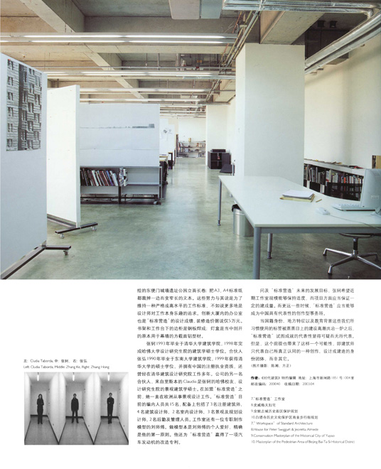 张轲1993年毕业于清华大学建筑学院,1998年完成哈佛大学设计研究生院的建筑学硕士学位。合伙人张弘1990年毕业于东南大学建筑学院,1999年获得清华大学的硕士学位,并拥有中国的注册执业资质,还曾经在清华建筑设计研究院工作多年。公司的另一名合伙人,来自里斯本的Claudia是张轲的哈佛校友,设计研究生院的景观建筑学硕士。在加盟“标准营造”之前,她一直在欧洲从事景观设计工作。“标准营造”目前的编内人员共15名,配备上包括了3名注册建筑师、4名建筑设计师、2名室内设计师、3名景观及规划设计师、2名后勤及管理人员。工作室还有一位专职制作模型的刘师傅。做模型本是刘师傅的个人爱好,精确是他的第一原则。他还为“标准营造”赢得了一项汽车发动机的改造专利。
