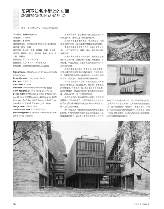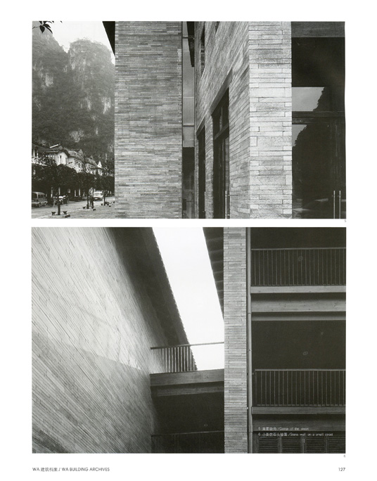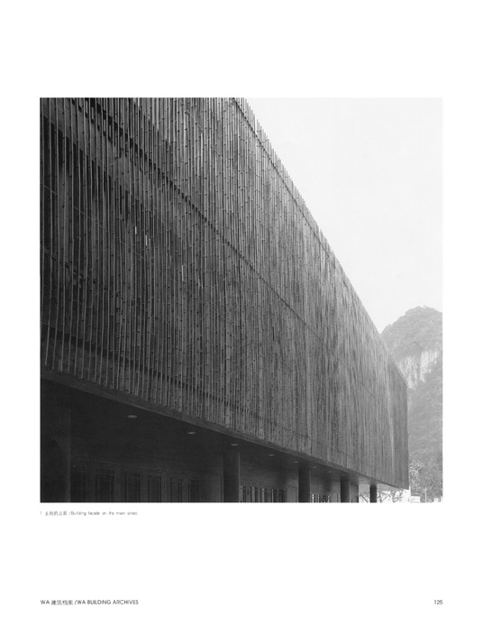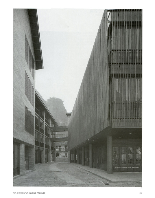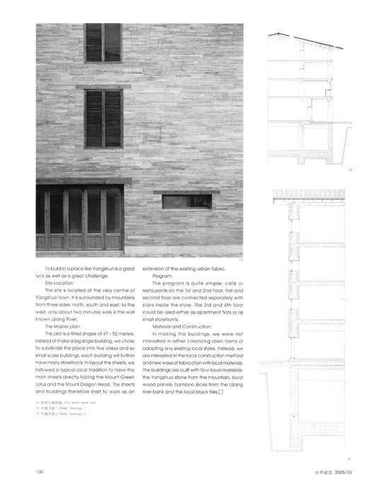 我们于是放弃了建筑师常有的自大和急于表现的欲望,开始用阳朔本地的方式垒砌和编织这几栋普普通通的房子,这几条小街就以阳朔自己的方式存在了--街是对着山的,街上的房子是自由的,几乎没有一个是直角的,这样随意地摆放在街边上;房子用的都是本地的石片、本地的瓦片、本地的木片和用江边毛竹削成的竹片。远远看去,这房子并没有什么稀奇,只是走进这几条小街的时候,才会有偶然邂逅的喜悦。
