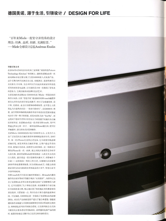 Domus China:在信息化时代的今天,家居产品和科技的结合也越来越紧密。我们了解到您参加了今年米兰家具展,针对Miele在这次米兰家具展上新发布的G6000您觉得有哪些有趣的设计点?