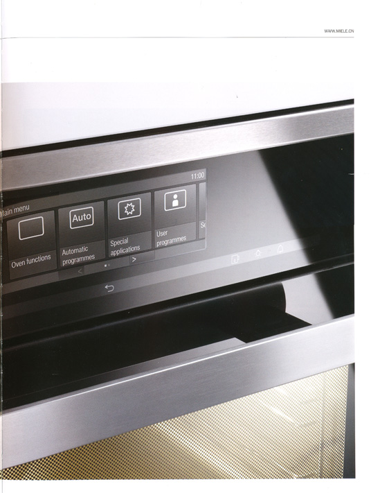 张轲:Miele之前的设计注重产品的实用性,现在则越来越多的把未来厨房的设计理念结合到里面,更多地强调产品视觉和感觉的统一。这次,Miele的新品系列设计都有非常突出的包豪斯风格,例如不锈钢把手和简洁统一的面板,厨电产品的面板被设计成了触摸滑屏。因为触摸屏要能抗高温,为了保证它的使用寿命长且不过时,Miele自主研发触摸屏。这次还有一个产品是洗碗机,这个洗碗机的门敲两下门会自动打开,如果你忘了关,过五秒钟它会自己合上。Miele对细节的追求很打动人。