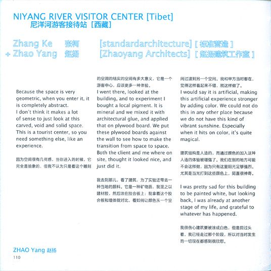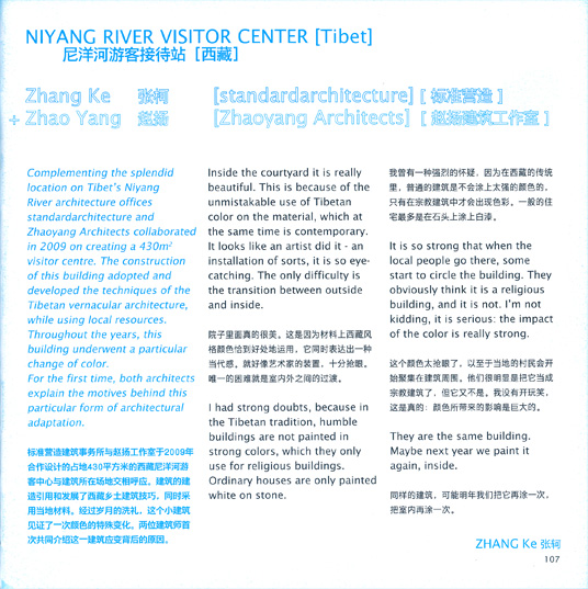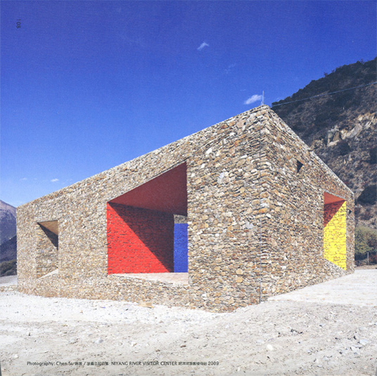 标准营造建筑事务所与赵扬工作室于2009年合作设计的占地430平方米的西藏尼洋河游客中心与建筑所在场地交相呼应。建筑的建造引用和发展了西藏乡土建筑技巧,同时采用当地材料。经过岁月的洗礼,这个小建筑见证了一次颜色的特殊变化。两位建筑师首次共同介绍这一建筑应变背后的原因。