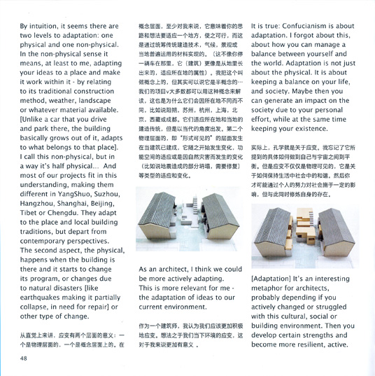 从直觉上来讲,应变有两个层面的意义:—个是物理层面的,一个是概念层面上的。在概念层面,至少对我来说,它意味着你的思路和想法要适应一个地方,使之可行,而这是通过统筹传统建造技术,气候,景观或当地普遍运用的材料实现的。 (这不像你停一辆车在那里,它(建筑)更像是从地里长出来的,适应所在地的属性)。我把这个叫做概念上的,但其实可以说它是半概念的…我们的项目v大多数都可以用这种概念来解读,这也是为什么它们会因所在地不同而不同,比如说阳朔,苏州,杭州,上海,北京,西藏或成都。它们适应所在地和当地的建造传统,但是以当代的角度出发。第二个物理层面的,即“形式可见的”的层面发生在当建筑已建成,它随之开始发生变化,功能空间的适应或是因自然灾害而发生的变化(比如说地震造成的部分坍塌,需要修复)等类型的适应和变化。