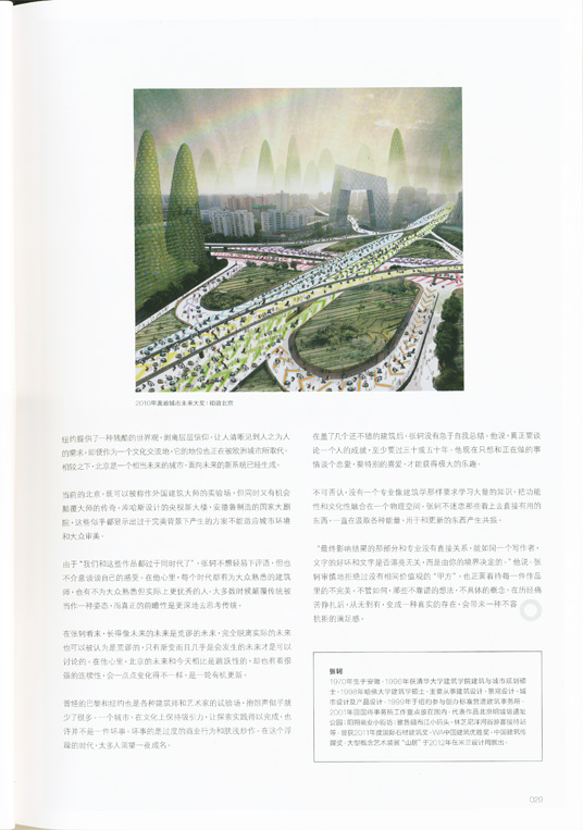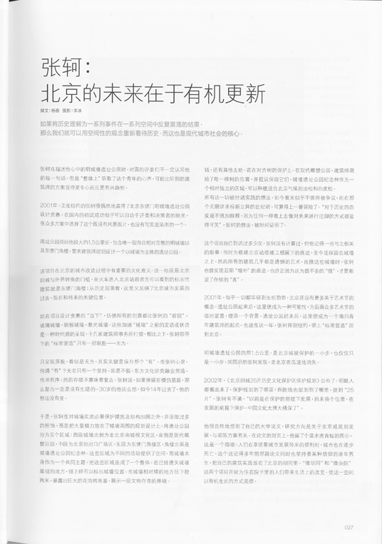 在张轲着来,长得像未来的未来是荒谬的未来,完全脱离实际的未来也可以被认为是荒谬的,只有渐变而且几乎是会发生的未来才是可以讨论的。在他心里,北京的未来和今天相比是跳跃性的,却也有着很强的连续性,会一点点变化得不一样,是一轮有机更新。