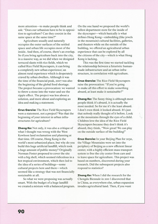 Zhang Ke: I would like to elaborate a little bit more about the West Kowloon Mountains project. Of course at that time, in 2007, nobody really talked about agriculture. It was still the peak of a frenzied time. But then when everybody was so infatuated about this crazy thing, it became a matter of gaining even more attention-to make people think and ask: "Does our urbanism have to be in opposition to agriculture? Can they coexist in the same space at the same time?"