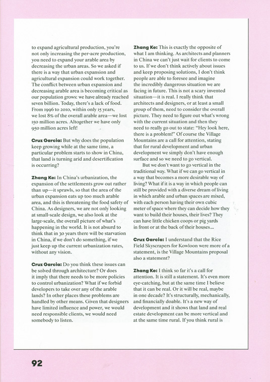 Zhang Ke: In China's urbanization, the expansion of the settlements grow out rather than up-it sprawls, so that the area of the urban expansion eats up too much arable area, and this is threatening the food safety of China. As designers, we are not only looking at small-scale design, we also look at the large-scale, the overall picture of what's happening in the world. It is not absurd to think that in 30 years there will be starvation in China, if we don't do something, if we just keep up the current urbanization rates, without any vision.