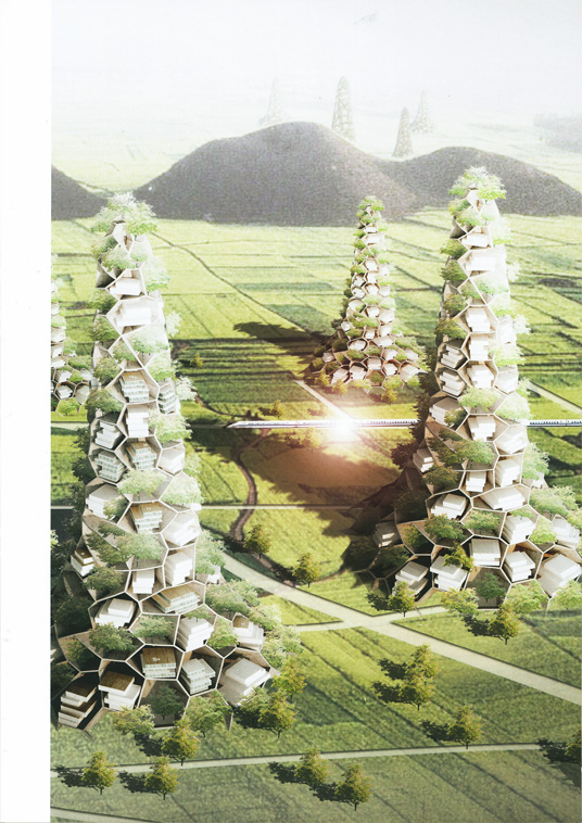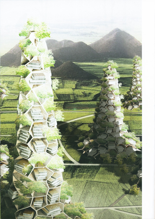 Zhang Ke: This is exactly the opposite of what I am thinking. As architects and planners in China we can't just wait for clients to come to us. If we don't think actively about issues and keep proposing solutions, I don't think people are able to foresee and imagine the incredibly dangerous situation we are facing in future. This is not a scary invented situation-it is real. I really think that architects and designers, or at least a small group of them, need to consider the overall picture. They need to figure out what's wrong with the current situation and then they need to really go out to state: "Hey look here, there is a problem!" Of course the Village Mountains are a call for attention, stating that for rural development and urban development we simply don't have enough surface and so we need to go vertical.