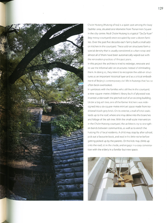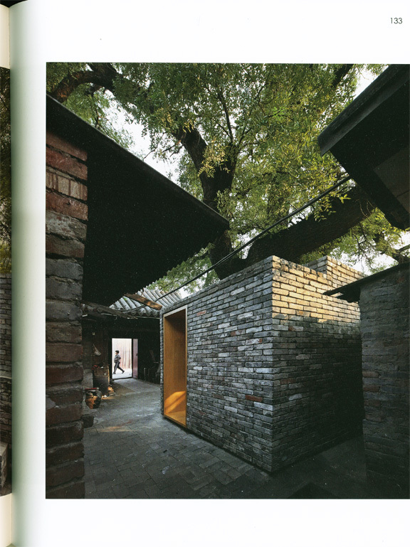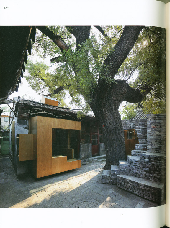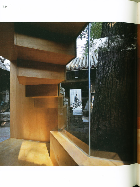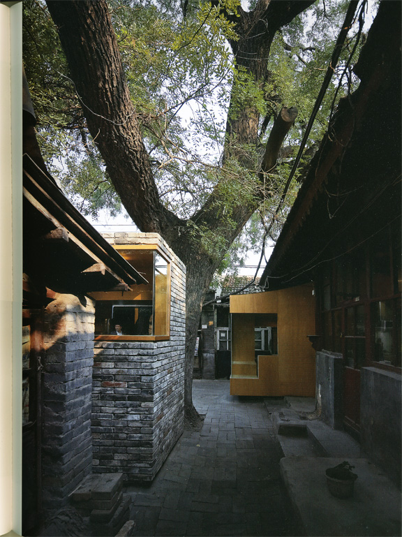 최근 추거지 개선을 이유로 이러한 공간들을 없애고 있지만, 이는 당 시 시민의 삶을 엿볼 수 있는 매개체이기에 보존할 만함 가치가 있다. 때문에 한때 12세대가 공유했던 집을 대상으로 한 이 작업에서는 이 러한 공간에 새로운 용도를 부여함으로써 공간을 재생시킨다. 대문을 들어오면 가장 먼저 커다란 물푸레나무가, 다음으로는 나무를 감싸고 있는 벽돌 건물이 눈에 띈다. 주방이었던 이곳은 6㎡의 조그 마한 예술 공간으로 탈바꿈했는데, 전통 회벽돌을 사용한 덕분에 기존 건물들과 어색함 없이 어우러진다. 또한, 바깥의 벽돌 계단을 따라 지 붕에 올라가면 고목의 나뭇가지와 잎사구를 가까이서 바라볼 수 있어, 마치 나무 위에 앉아있는 듯한 착각이 들기도 할 것이다.