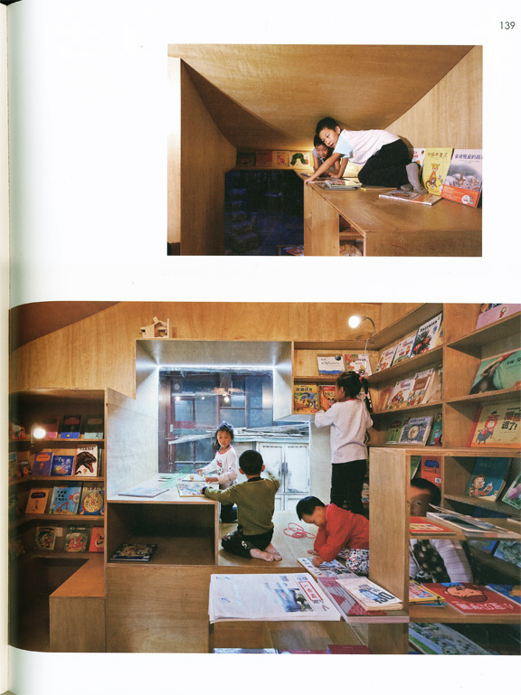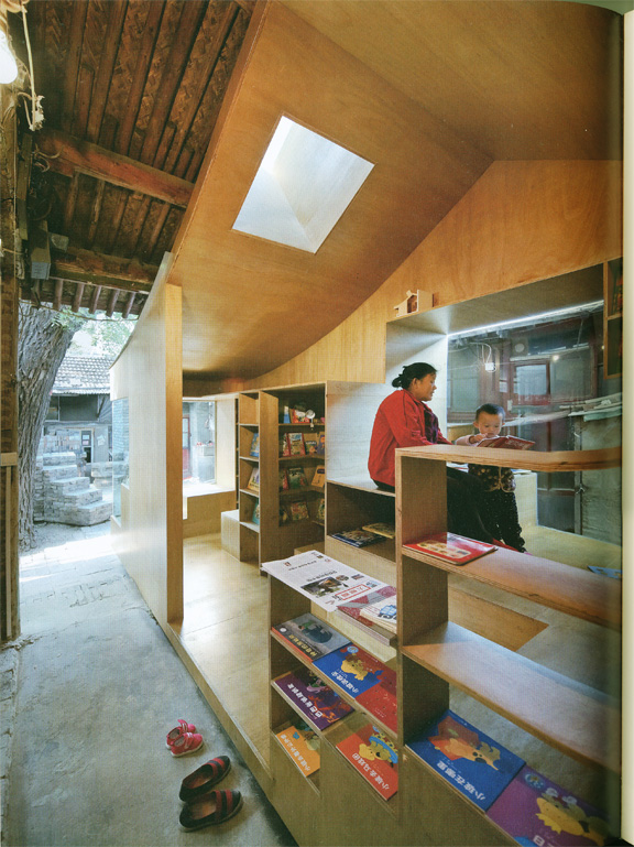 In symbiosis with the families who still live in the courtyard, a nine-square-meter children's library built of plywood was inserted underneath the pitched roof of an existing building. Under a big ash tree, one of the former kitchens was redesigned into a six-square-meter mini art space made from traditional bluish grey brick. On its exterior, a trail of brick stairs leads up to the roof, where one may delve into the branches and foliage of the ash tree. With the small-scale intervention in the Cha'er Hutong courtyard, the architects try to strengthen bonds between communities, as well as to enrich the hutong life of local residents. A child may stop by after school, pick out a favourite book, and read in his little niche before getting picked up by the parents. Or the kids may climb up onto the roof, sit in the shade, and engage in a cosy conversation with the elderly in a familiar but new space.