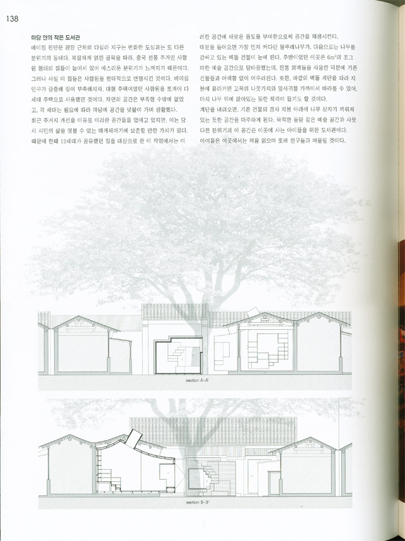계단을 내려오면, 기존 건물의 경사 지봉 아래에 나무 상자가 끼워져 있는 듯한 공간을 마주하게 된다. 묵직한 돌담 같은 예술 공간과 사뭇 다른 분위기의 이 공간은 이곳에 사는 아이들을 위한 도서관이다. 아이들은 이곳에서는 책을 읽으며 또래 친구들과 어울릴 것이다.