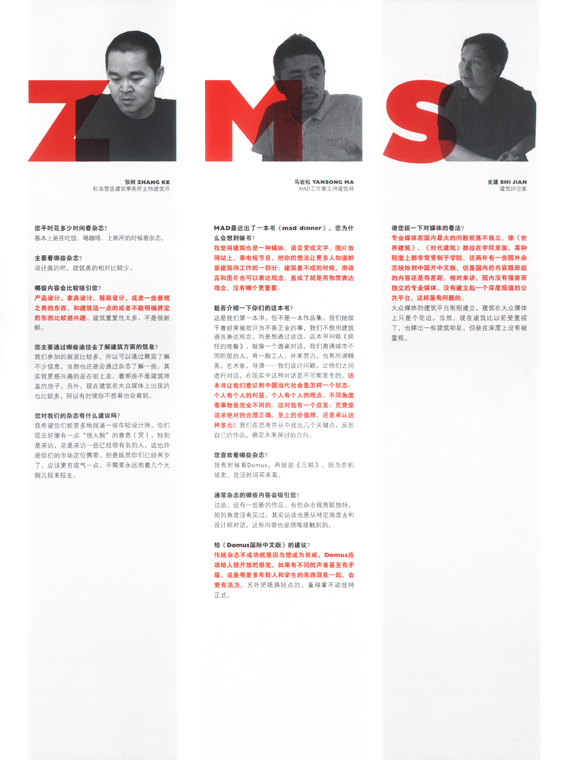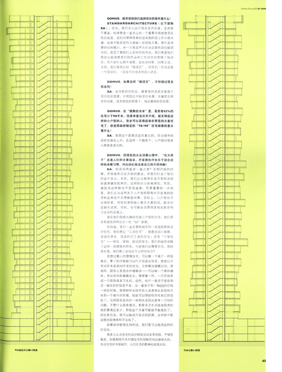 SA:是否能抓住机会,最重要的其实是看每个项目的实现度。中国现在不缺项目来源,关键是怎样在时间紧、成本较低的前提下,保证最高的实现度。 DOMUS:在“跳舞的书本”里,虽然有52%的住宅小于90平米,但其单套总价并不低,能买得起这样的小户型的人,完全可以买得起单价更低的大套住宅了。你觉得政府制定的“70/90”住宅政府的意义是什么?