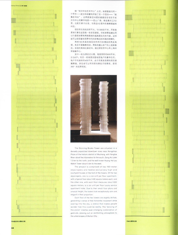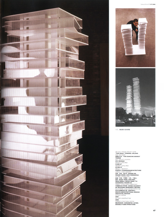 两栋160米高的高层如同用书本摞起的两座高塔,各层平面随意扭动,两栋的重心自下向上逐渐靠近;双塔的高细比接近10,超过原世贸中心和上海环球金融中心。