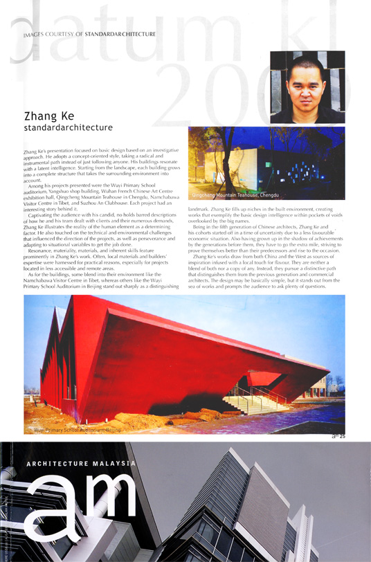 Being in the fifth generation of Chinese architects, Zhang Ke and his cohorts started off in a time of uncertainty due to a less favourable economic situation. Also having grown up in the shadow of achievements by the generations before them, they have to go the extra mile, striving to prove themselves better than their predecessors and rise to the occasion.