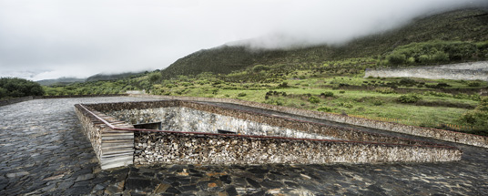 坡道辗转处形成一个个开阔平台。平台不仅仅是流线间的过渡,在运动之后的静止中的短暂思考,同时也为瞭望山野建立了一系列独特的视框。平台的边界清晰地定义了视野,突兀的山崖和荒乱的草木也在这个鲜明的视框中夹带了几分人文色彩。通过设置开阔平台,使人们在此驻足,平台引导着人的视线,唤起了山谷与河流自身的神性,使人心中产生敬畏。我们在探讨一个关于现象的问题: 一片景观的本身也许原始冗余而自我重复,然而人们从某个特定角度对它的思考与凝视却能赋予它精神性。建筑所能做的,只是提供一个思考的角度,一个凝视的方向。