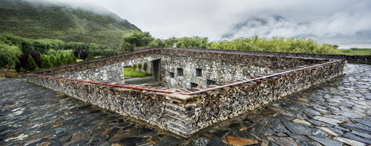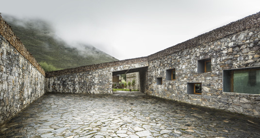 建筑在个别转折处,围拢成一个户外庭院。站在庭院里的人看到天空的切割,感受到对院外景色的神秘感与未知感。除此之外,这些的户外空间更是原始环境和人文环境之间的相互牵制,相互流通,让人曝露回归于山野自然间的同时给予人文的庇护。
