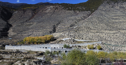 像标准营造的其它西藏项目一样,娘欧码头的地域特征不是通过具象的装饰或形式来表达,而是通过本地特有的建筑与土地山川的一体关系,以及本地材料的创造性再运用得到演绎。娘欧码头的主体为混凝土框架结构加石头墙砌体完成,墙体的石头是从基地附近采集,由当地的石匠通过自己的砌造方式构成的,观景平台的栏杆以当地拾来的木柴充当,经过风吹日晒,一种西藏特有的质朴的精神性和隐秘的当代性悄然呈现。