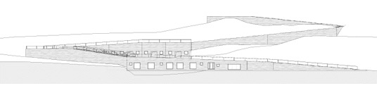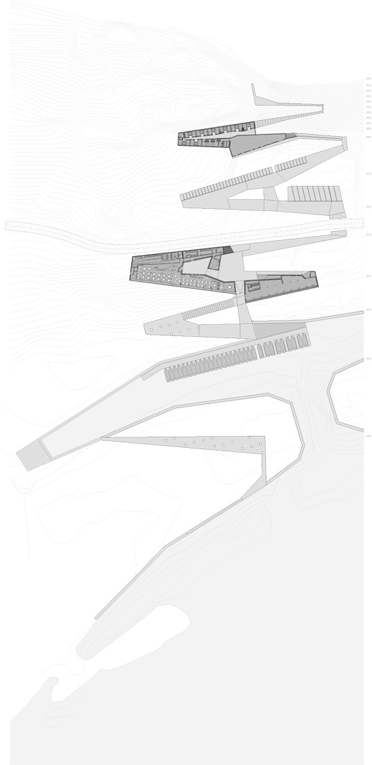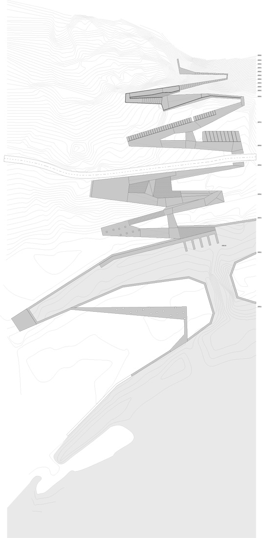 The project originates from a reading of the primal landscape: in Tibet, architecture cannot be separated from landscape. The two are equivalent. In our design we embed the building into the landscape, neither as an attachment or a detachment. Hence we arrive at this zigzagging path, which linearly integrates all complex functions. Rising from the highway, the ramp organizes parking, staff dormitories, offices, conference rooms and theater, forming a wide platform at 3000m altitude, guiding one's eyes back at the magnificent union of rivers. From the highway down to 2971 altitude, one finds a ticket office, bathrooms, waiting room, canteen and kitchen leading to a dock near the water. The ramp defines the relationship between various spaces, creating a chain of platforms and places. Each and every space firmly lodges into the landscape, subtly mediating the human body with nature.