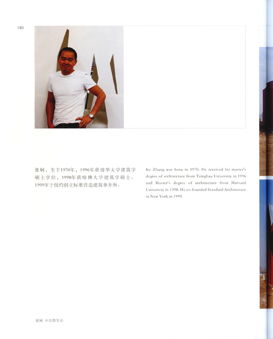 Ke Zhang was born in 1970. He received his master's degree of architecture from Tsinghua University in 1996 and Master's degree of architecture from Harvard University in 1998. He co-founded Standard Architecture in New York in l999.