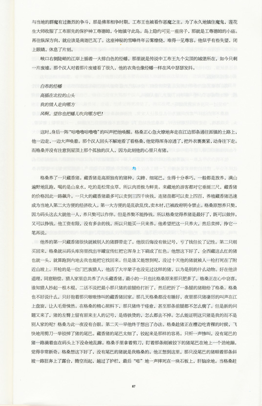 这时,身后一阵“咕噜噜咕噜噜”的叫声把他唤醒。格桑正心急火燎地奔走在江边那条通往派镇的土路上,他一边走,一边大声唤着。那个汉人回头不解地看了看格桑,他觉得浑身凉透了,把外衣裹裹紧,动身往下走。而格桑并没有注意到屋顶上那个孤独的汉人,因为此刻他的心里只有猪。