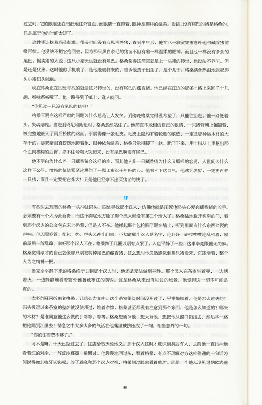 他养的第一只藏香猪很快就被别人的猪群带走了。他很后悔没有做记号,亏了钱但长了记性。第二只刚买回来,格桑就从码头库房里找出半罐宣传红把它浑身上下刷成了红色。他想这下好了,全西藏这么红的猪也就一头,就算跑到内地去我也能把它找回来。但是谁又能想到呢,没过十天他的猪就被人一枪打死在了附近山坡上。开枪的是一位门巴族猎人,他活了大半辈子也没见过这样的猪,以为是别的什么动物。好在他讲道理,同意赔偿。猎人家里总共养了六头藏香猪,最小的一只也比格桑原来那只肥多了。格桑正在心中窃喜,谁知猎人抄起一根木棍,二话不说把最小那只猪的前腿给打折了,然后把折了一条腿的猪赔给了格桑。格桑也不好说什么,只好抱着那只嗷嗷惨叫的藏香猪回家。那几天格桑都没有睡好,夜里那只猪凄厉的叫声在江上盘旋,让人毛骨悚然。在格桑的精心照料下,那只猪终于痊愈,甚至那条前腿都不怎么瘸了。但是新的问题又来了,猪的左臀上留有原来主人的记号,是烙铁烫的,怎么都去不掉。怎么能证明这只猪是我的而不是别人家的呢?格桑为此一夜没有合眼。第二天一早他终于想出了办法。格桑趁猪正在槽边吃青稞的时候,飞快地用剪刀一举铰掉了猪的尾巴。藏香猪的尾巴太细了,铰起来是那样的容易。只听一声惨叫,没有尾巴的猪一路滴着血在码头上下没命地乱蹿。格桑手里拿着剪刀,盯着那条刚被铰下的猪尾巴在地上一个劲地蹦,觉得非常新奇。格桑想这下好了,没有尾巴的猪就是我格桑的。他正想到这里,那只没尾巴的猪顺着那条斜坡一路狂奔上了露台,腾空而起,越过了护栏,最后“嘭”地一声摔死在一块石板上,肝脑涂地。当格桑赶过去时,它的眼眶还在汩汩地往外冒血,而眼睛一直瞪着,眼神是那样的温柔。没错,没有尾巴的猪是格桑的,只是属于他的时间太短了。