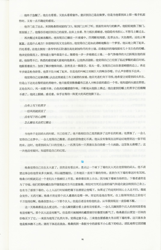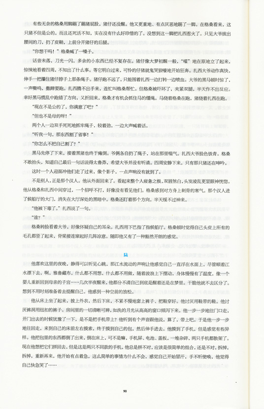 过了一会儿,门外有个胖子分开人群硬挤进来,跌跌撞撞地来到床边,一把握住那个汉人的手,说到,张博士,你怎么来啦?不在北京待着,到这来干吗?那个汉人犹豫了一下,显然他也认出了那个胖子,他指着满屋子的人问到,这是……胖子有些兴奋地转脸对大家说,这是张博士,大建筑师!这个码头就是他设计的。谁知房间里的气氛变得更加压抑,大建筑师被下了毒,事情比想象的还严重。一位目光炯炯的公安干警上前半步,问到,博士,你是什么时候发现自己被下毒的?大建筑师脸上又浮现出那种迷惑的神情。什么下毒?他皱起了眉头,喃喃地说到,我一直惦记着回来看看,码头建好以后我就没来过,一晃好多年,最近正好有时间就来了,没有打招呼,怕麻烦你们,什么下毒?房间里所有人的视线齐刷刷地转向一角的格桑。这太突然了,格桑整个人被钉在了那里,呆若木鸡。这时从外面又随风飘来一阵微弱的、极为哀怨的叫声。只有格桑清楚,是那只猪在哼哼。