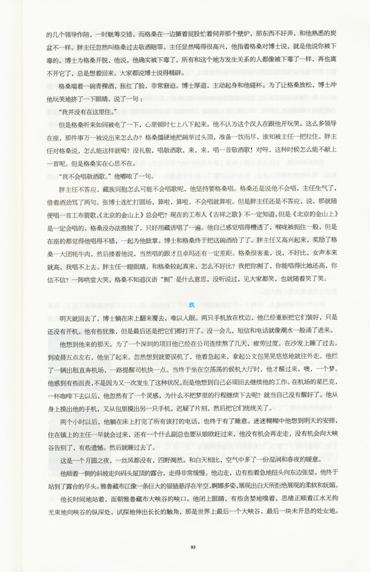 胖主任不答应,藏族同胞怎么可能不会唱歌呢,他坚持要格桑唱。格桑还是说他不会唱,主任生气了,借着酒劲骂了两句。张博士连忙打圆场,算啦,算啦,不会唱就算啦。但是胖主任还是不答应,说,那就随便唱一首工布箭歌,《北京的金山上》总会吧?现在的工布人《吉祥之歌》不一定知道,但是《北京的金山上》是一定会唱的。格桑没办法推脱了,只好用藏语唱了一遍。他自己感觉唱得糟透了,喉咙被扼住一般,但是在座的都觉得他唱得不错,一起为他鼓掌。博士和格桑终于把这碗酒给了了。胖主任又高兴起来,奖励了格桑一大团牦牛肉,然后搂着他说,当然唱的跟才旦卓玛还有一定差距。格桑很害羞,说,不好比,女声本来就高,我唱不上去。胖主任一瞪眼睛,和格桑较起真来,怎么不好比?我把你劁了,你能唱得比她还高,你信不信?一阵哄堂大笑。格桑不知道汉语“劁”是什么意思,没听说过,见大家都笑,也就随着笑了笑。