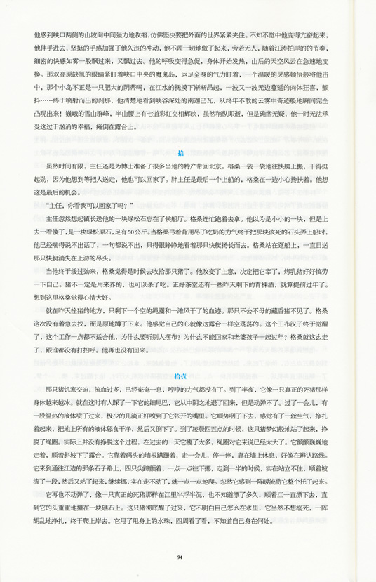它再也不动弹了,像一只真正的死猪那样在江里半浮半沉,也不知道漂了多久,顺着江一直漂下去,直到它的头重重地撞在一块礁石上。这只猪彻底醒了过来,它不明白自己怎么在水里,它当然不想溺死,一阵胡乱地挣扎,终于爬上岸去。它甩了甩身上的水珠,四周看了看,不知道自己身在何处。