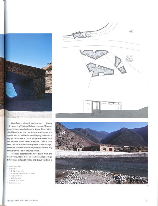 Mirui Road is a tourist road that meets Highway 318 connecting Tibet and Sichuan province. This road meanders southwards along the Niyang River. Within this 20km distance to the Brahmaptra Canyon, the specific terrain and landscape of Niyang River can be enjoyed from the road. Daze Village was chosen to be the entrance to this tourist attraction. There is little land left for further development in this village, therefore the river beach along the road was the only choice for the site of a tourist center.