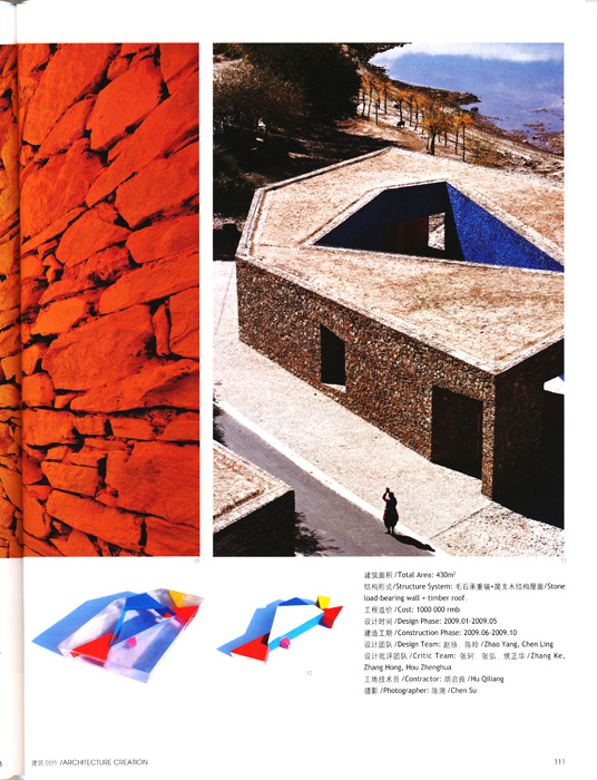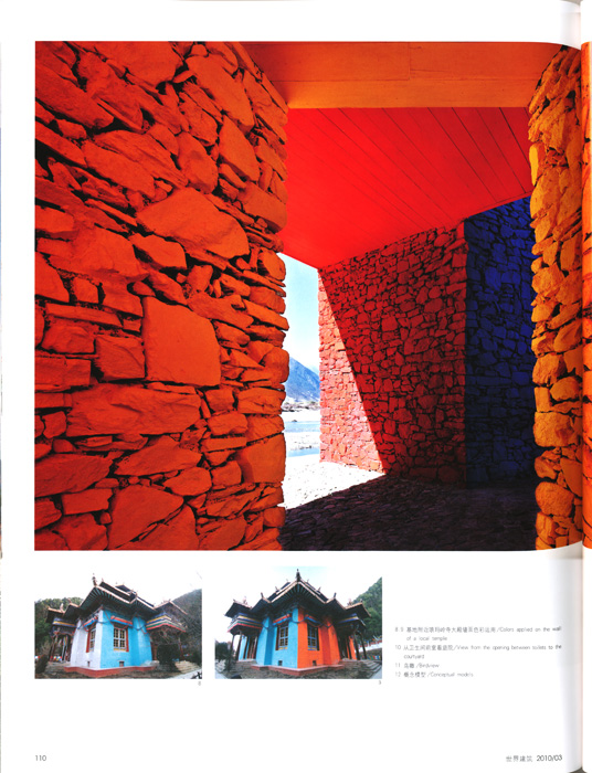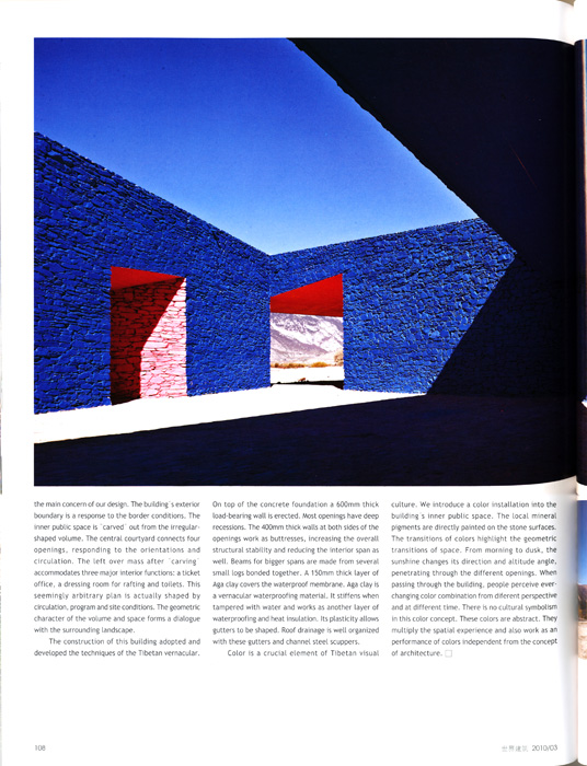 颜色是西藏视觉文化传统的重要元素。我们把一个颜色的“装置”引入这个建筑内部的公共空间。西藏的矿物颜料被直接涂刷在毛石墙面上。颜色的转换强化了空间的几何转换。从日出到日落,不同方向和高度角的阳光射入各个洞口。从建筑中穿过时,人们可以在不同的角度和时刻体验到不断变化的色彩效果。这些颜色没有西藏传统文化中的象征性,它们是单纯而抽象的,强化了建筑的空间体验,同时也作为独立于建筑的“装置”演绎颜色本身的魁力。