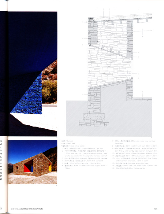 The construction of this building adopted and developed the techniques of the Tibetan vernacular. On top of the concrete foundation a 600mm thick load-bearing wall is erected. Most openings have deep recessions. The 400mm thick walls at both sides of the openings work as buttresses, increasing the overall structural stability and reducing the interior span as well. Beams for bigger spans are made from several small logs bonded together. A 150mm thick layer of Aga clay covers the waterproof membrane. Aga clay is a vernacular waterproofing material. It stiffens when tampered with water and works as another layer of waterproofing and heat insulation. Its plasticity allows gutters to be shaped. Roof drainage is well organized with these gutters and channel steel scuppers.