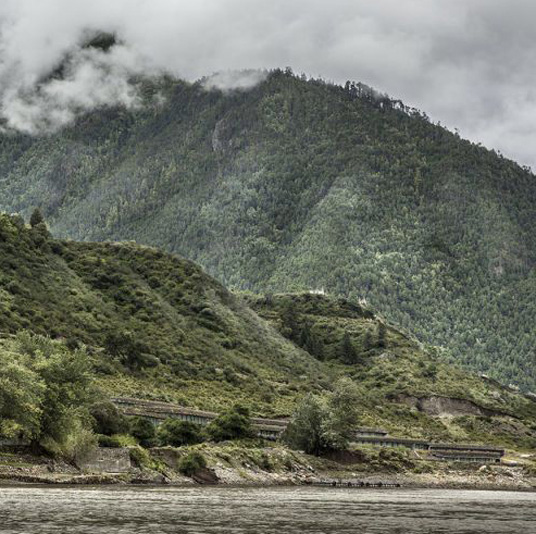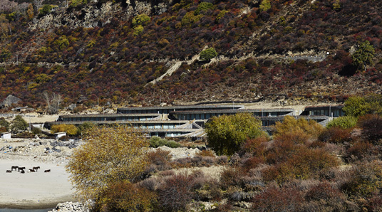 The hostel is situated along the slope of the Yarlung Tsangpo River near Pai Town, the small locality that marks the entrance to the Grand Canyon. The site is facing the river to the north, the 7,782 m-high peak of Namcha Barwa to the east, the 7,294 m Gyala Peri Peak to the northeast, and Mount Duoxiongla to the south. To design a hostel with one hundred rooms in such an environment posed a great challenge for the architects. Inspired by the “steps” strategy often seen in local villages when built on slopes, they decided to design a series of stepped, single-storey, linear buildings, each with unimpeded views of the river and mountains to the north and east. On four steps, each set back and grouped in a cresent-shaped form, the building is integrated like a horizontal cut in the foot of the mountain. With roofs covered by earth, shrubs and rocks, the building gently embeds itself into the sloped landscape. Viewed from a distance, the hostel disappears like a few thin leaves floating along the river.