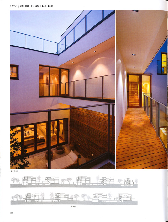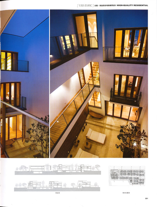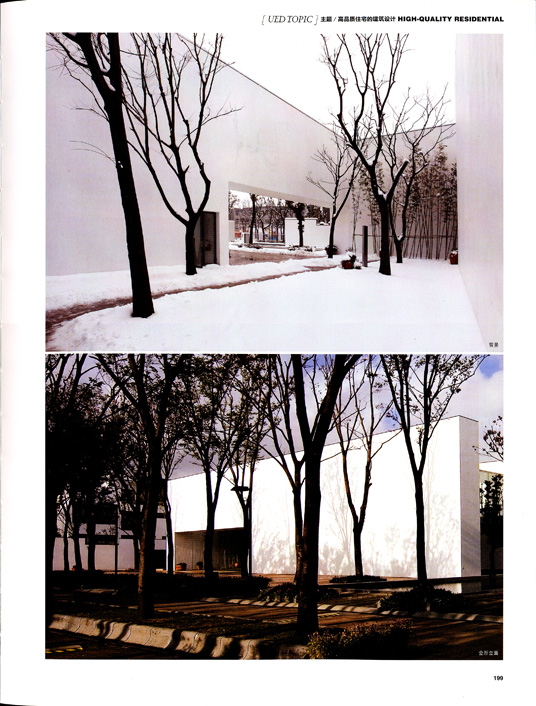 建筑单体为现代院落住宅,小面宽、大进深三进院、高院墙、立体景观,每一房间均有南向采光,同时不同尺度的若干庭院亦可满足从半私密到私密的丰富家居需要。