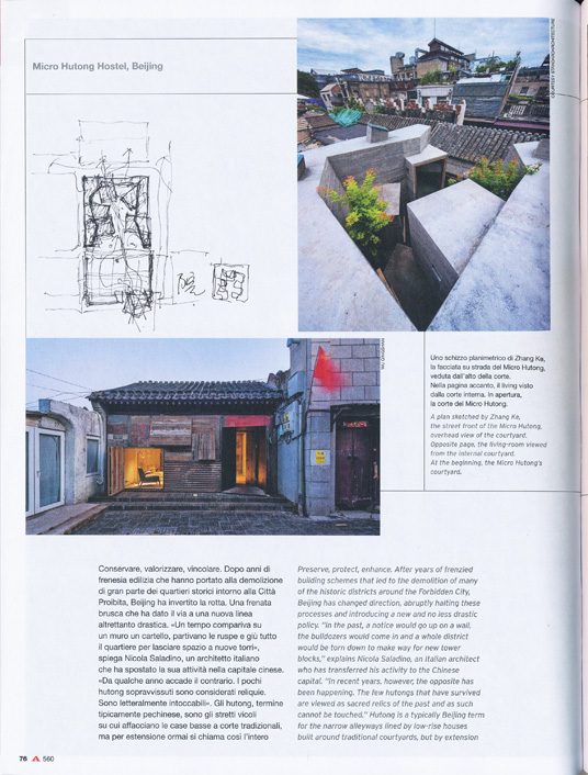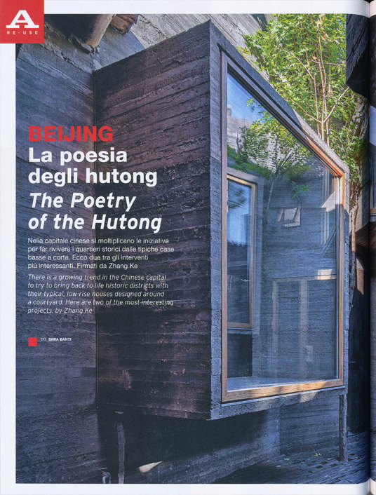 Preserve, protect, enhance. After years of frenzied building schemes that led to the demolition of many of the historic districts around the Forbidden City, Beijing has changed direction, abruptly halting these processes and introducing a new and no less drastic policy. "In the past, a notice would go up on a wall, the bulldozers would come in and a whole district would be torn down to make way for new tower blocks," explains Nicola Saladino, an Italian architect who has transferred his activity to the Chinese capital. "In recent years, however, the opposite has been happening. The few hutongs that have survived are viewed as sacred relics of the past and as such cannot be touched." Hutong is a typically Beijing term for the narrow alleyways lined by low-rise houses built around traditional courtyards, but by extension has come to refer to the neighbourhood as a whole. Those situated around the Forbidden City are in an excellent state of repair and much sought after by the city's middle class: meticulously constructed grey stone houses, with tiled pitched roof and from which trees emerge suggesting lush courtyards hidden away inside. The more outlying hutongs are quite different. Their small courtyards, originally designed for a single family, are now home to six, because rents are high (around 2,000 euros a month) and this has resulted in overcrowding and inadequate sanitary conditions. But now that the State has taken on the task of protecting the city's heritage, there has been a whole host of ideas on how to make these districts more liveable without altering them or triggering a process of gentrification. In the Baitasi hutong, two young talented architects called Dong Gong and Xu TianTian Hua Li have recently started restoring houses and revitalizing streets and wider sections of road with the participation of local residents (coordination is by the Italian Beatrice. Leanza, creative director of the Baitasi Remade programme). There is also much activity in the Dashilar hutong, situated within walking distance of Tienanmen Square. This is the site for two projects by Zhang Ke, the architect who founded the Standard Architecture studio in Beijing - and both are discussed in this issue of Abitare. The first is a micro-hostel that provides space for four homes, a living-room and even a bathroom (something that can never to be taken for granted in Beijing, where shared facilities are still commonplace) with just 30 square metres to play with. The street gives access to the living area, which looks out onto a tiny courtyard that is extremely picturesque as a result of the building's design: a "cascade" of five concrete cubes vertically connected by simple rung ladders. The second is a crèche, created inside a house that, before becoming the home of a dozen families, was a Buddhist temple. Its courtyard is a riot of accretions and small volumes containing kitchens (one per family). Here, Zhang decided to maintain the add-on elements as a tribute to the past and as a testament to the stratified way in which living is organised in the hutongs, introducing a number of, ultra-designed wooden "boxes" that contain a children's library (measuring nine square metres) and an art workshop (just six square metres). At the centre of the courtyard, around the ash tree that had been almost completely swallowed up by the many additions is a brick staircase that serves as a podium for classes and contains another tiny utility space for the children. This is a delicate and poetic design project that deservedly won the 2016 Aga Khan Award.