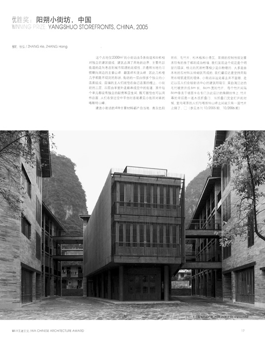 作为一个旁观者,由于某种机缘得以比较完整地看到“标准营造”事务所阳朔商业小街坊的设计、论证与建成的过程。时隔一年多,大约是这座建筑灵动的设计、强烈的完工照片与精准的建筑图纸,打动了评委,使它在WA奖的评选中脱颖而出。然而,本文对于这座获奖建筑的评论,却源自不久前看到的一段它建成一周年的DV作品,希望可以呈现给读者一些照片与图纸之外的、这座建筑融入到城市之中后所焕发出的气质,我想大约可以称之为“平民性“。