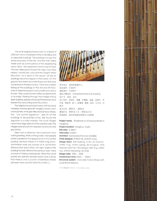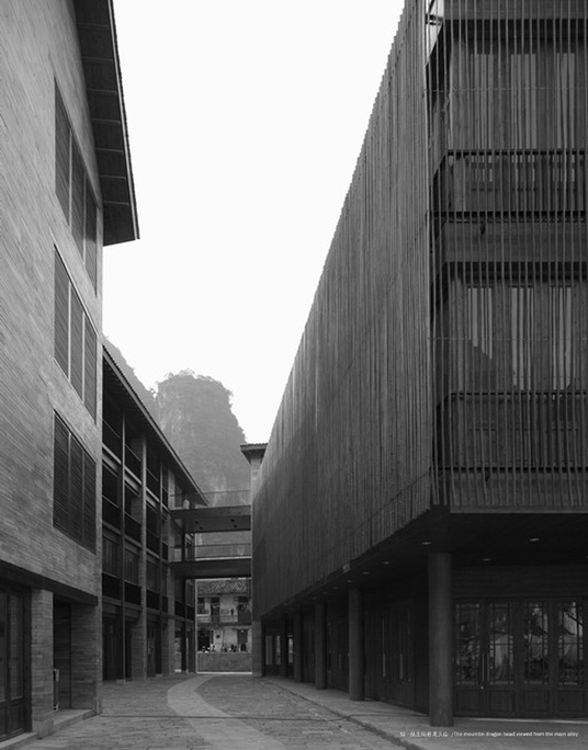 建造小街坊的4种主要材料都产自当地:青灰色阳朔石、毛竹片、杉木板和小青瓦。阳朔的控制性规划要求所有的房子都刷成白粉墙,我们发现这个规定是个明显的错误,桂北的民居村落极少是白粉墙,大多是由本地的石材和灰砖砌筑而成的,我们最后还是坚持用阳朔石砌筑建筑的墙体。小街坊从远处看去并不显眼,走近以后人们会被街坊中心的建筑所吸引,采自漓江边的毛竹被劈开成6m长、6cm宽的竹片,每个竹片间隔8cm垂直于墙面卡在专门为此设计的角钢挂件上,竹片幕的背后是一道木质折叠门,当折叠门完全打开的时候,室内喝茶的人们与喀斯特山峰之间就只有一层竹片之隔了。(参见本刊10/2005期,10/2006期)