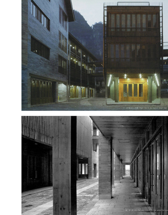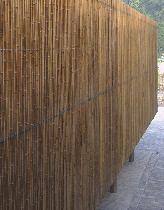 Seen from a distance, the storefronts have nothing startling. While coming closer, most people will be surprised by the appearance of the central building, Bamboo stripes of 6-meter-long and 6-centimeter-wide are placed at 8 centimeter distance from each other, with right angle to the building facade. Behind the bamboo layer, there is a layer of folding wood panels. When the wood panels are opened, people could have a sense that there is only a curtain of bamboo stripes between them and the Karst Mountains.